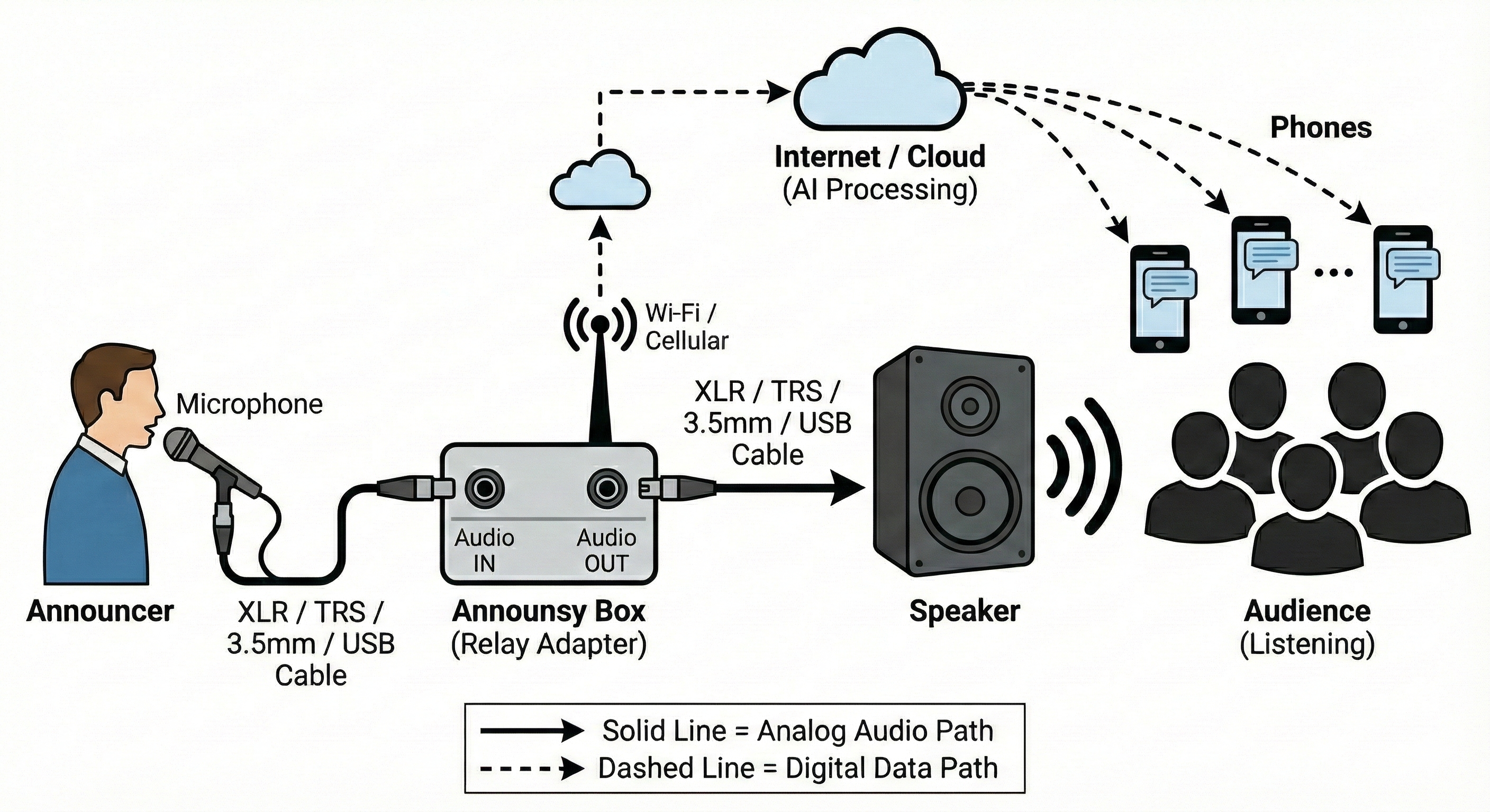 Plug your mic into Announsy, then Announsy into your speaker system. You're live.